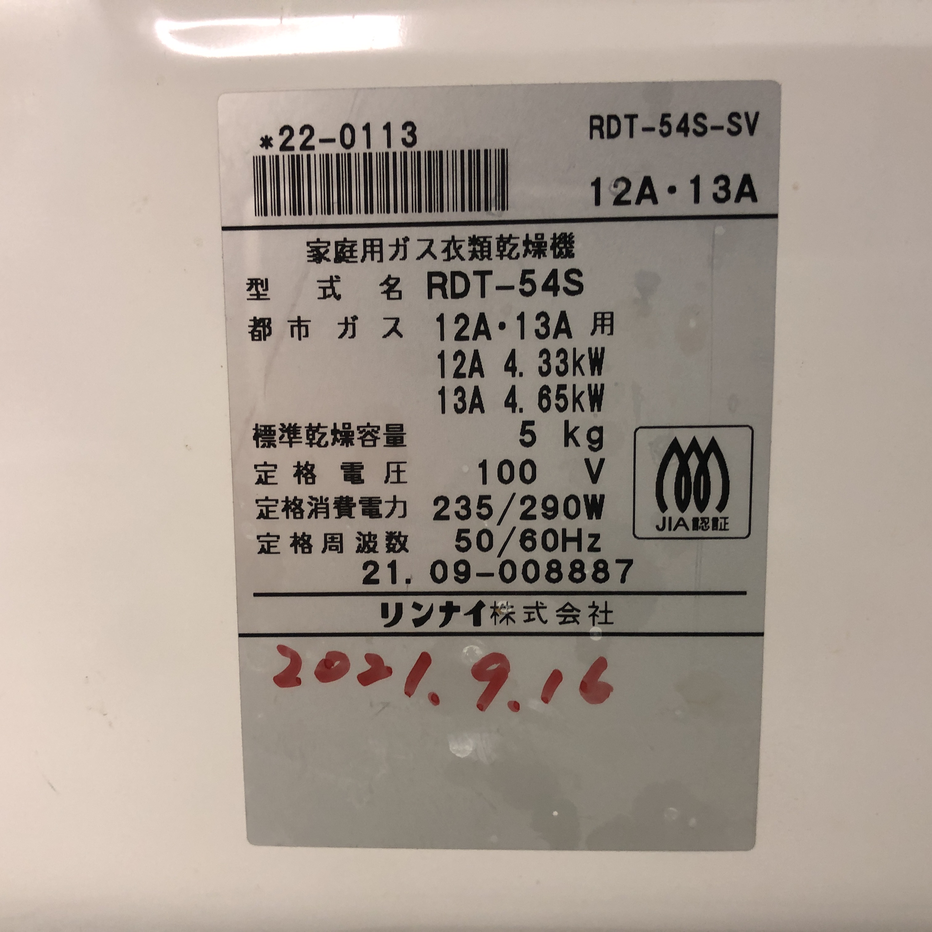 ガス衣類乾燥機 都市ガス用 Rinnai リンナイ 乾太くん 2021年製 5kg ピュアホワイト RDT-54S 直接お渡し歓迎 FBK841445相