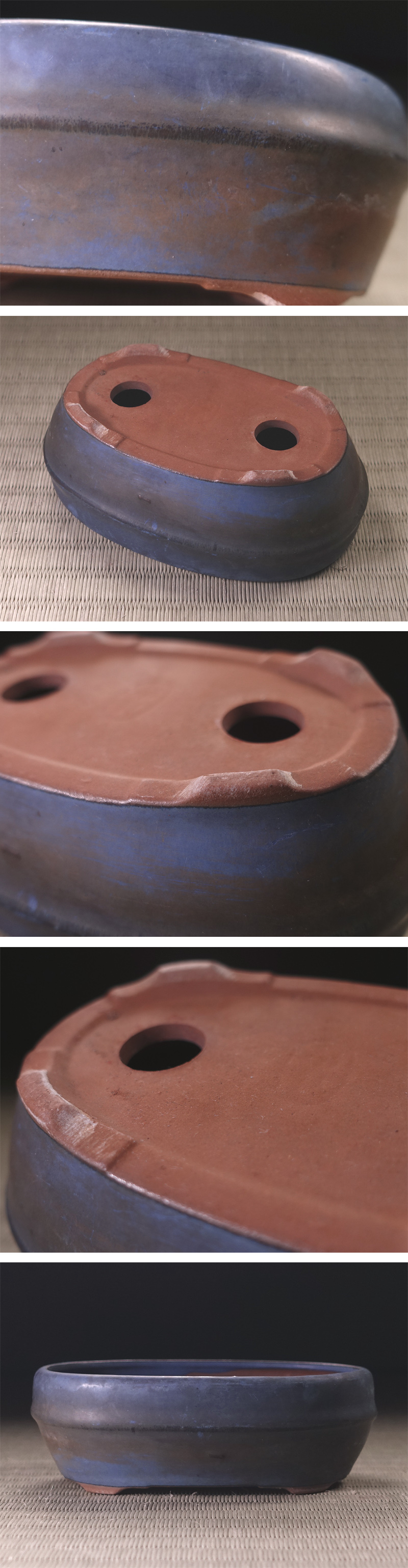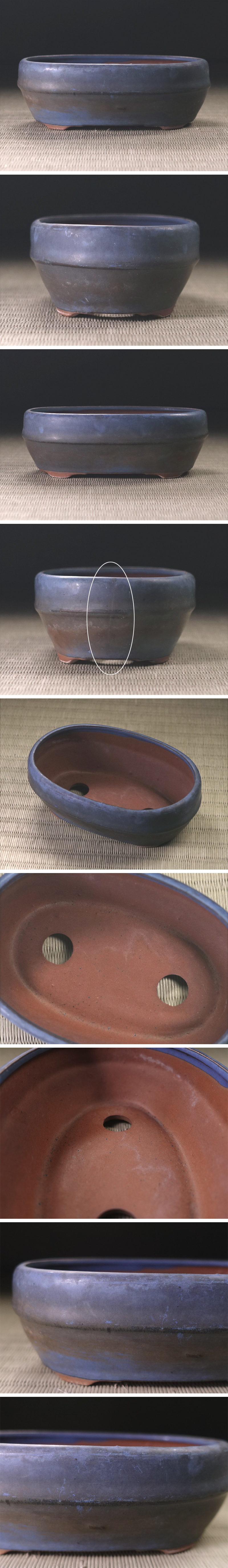 紺色の釉色が実に印象深い楕円盆栽鉢です。
