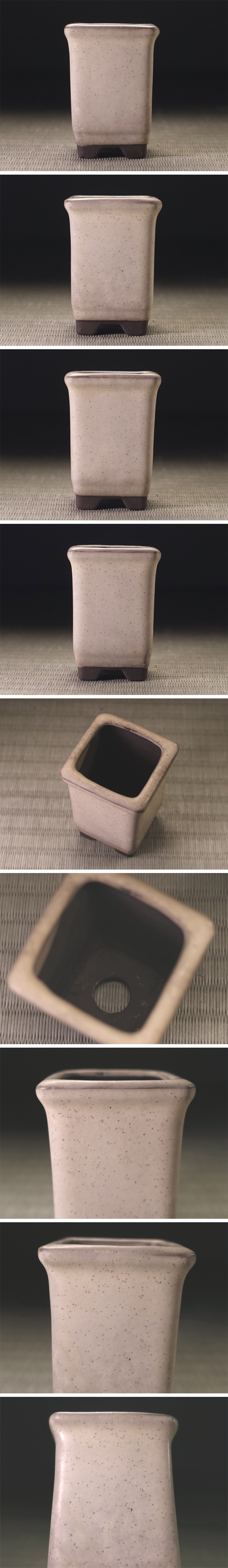 正方筒形とした盆栽鉢で、柔らかな白交趾釉が器を彩り温和な景色を見せています。